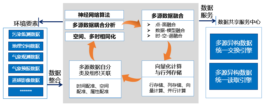 多源数据融合技术的主要优势在于可以取得多角度、多维度的数据信息,从而提高数据的准确性和可靠性。此外,这种技术还可以利用各种数据源之间的相互补充,弥补数据源之间的缺陷,从而提高了数据的完整性和可信度。多源数据融合技术的应用还可以提高环境监测的效率和精度,对于实现智慧城市、环境治理和预警等领域具有重要的意义。 平台对各类环境要素数据,进行同化--融合处理,实现了多源数据的自分类及组织关联,尤其对于时间序列数据与空间数据的融合和同化方面,实现了多时相同化、空间同化和融合校正,并最终实现“时 - 空 - 谱一体化融合”。在此过程中,采用神经网络算法对数据训练校准,对多源数据进行耦合研判分析。