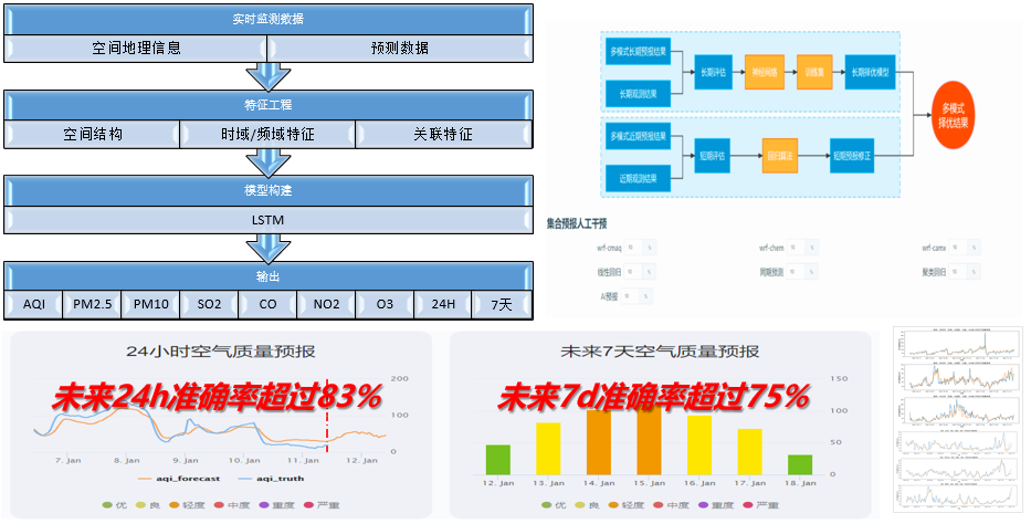 建立“机器学习+数值模式”的双预报引擎智能择优预报技术体系,以WRF-CMAQ、WRF-Chem大气模型为基础, 以多源数据融合和人工智能为核心技术, 融合资料同化、 多模式集合预报、 机器学习、 深度学习等先进技术, 自主研发了业内先进的空气质量预报预警系统,实现了多时间尺度 (短临-近期-中期-长期)、多空间尺度(区域、 城市、站点、网格)的预测预报。